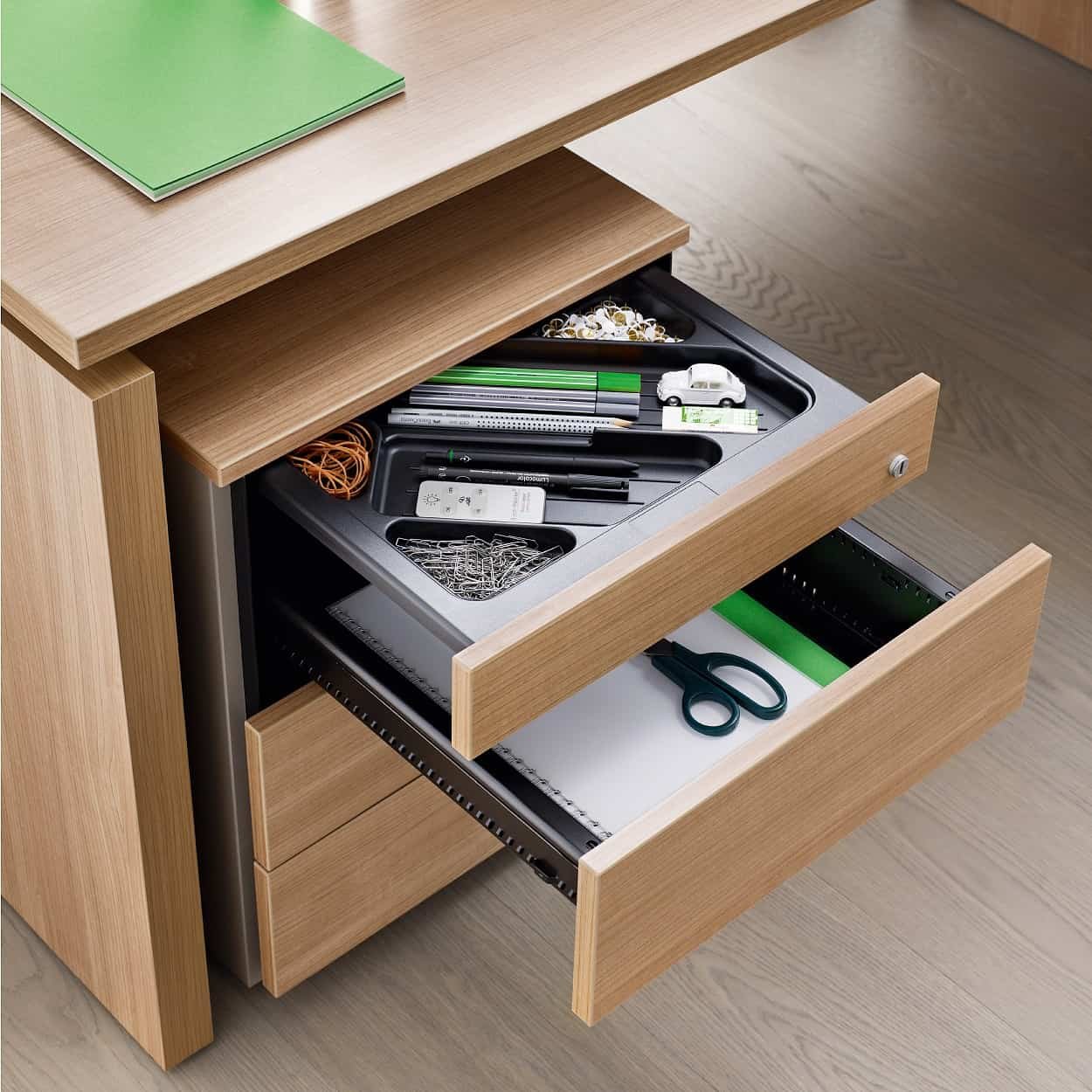 Jei reikėtų apibūdinti šią baldų kolekciją dviem žodžiais – tai būtų precizika ir pažanga. Stalai itin erdvūs, puikiai tinka darbuotojams, kurie dirba kompiuteriu ir su brėžiniais. Gausus priedų pasirinkimas leidžia susikurti patogią ir individualią darbo aplinką.
