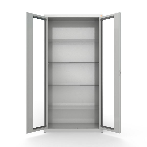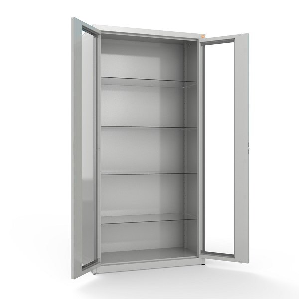 Durys pagamintos iš grūdinto stiklo, todėl spintos turinys aiškiai matomas neatidarant durų. Tai leidžia greičiau surasti reikalingus medikamentus, dokumentus ar medicinines priemones. Skaidrios vitrininės durys suteikia modernų vaizdą bei padeda palaikyti tvarkingą darbo aplinką.