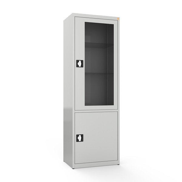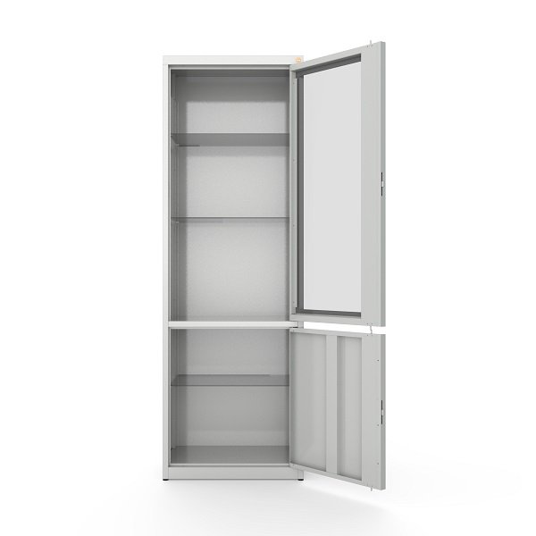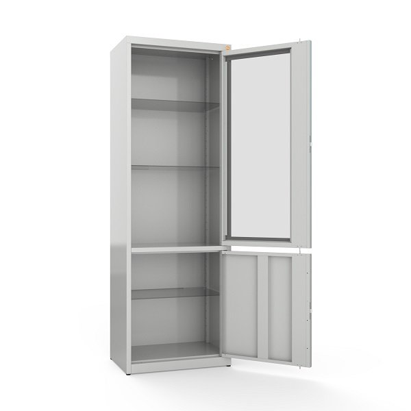 Viršutinėje spintos dalyje įrengtos stiklinės durys leidžia lengvai matyti laikomas priemones neatidarant spintos. Tai ypač naudinga gydymo įstaigose, kur svarbus greitas medikamentų ar instrumentų pasiekiamumas. Skaidri vitrininė dalis taip pat suteikia modernų bei tvarkingą vaizdą darbo aplinkai.