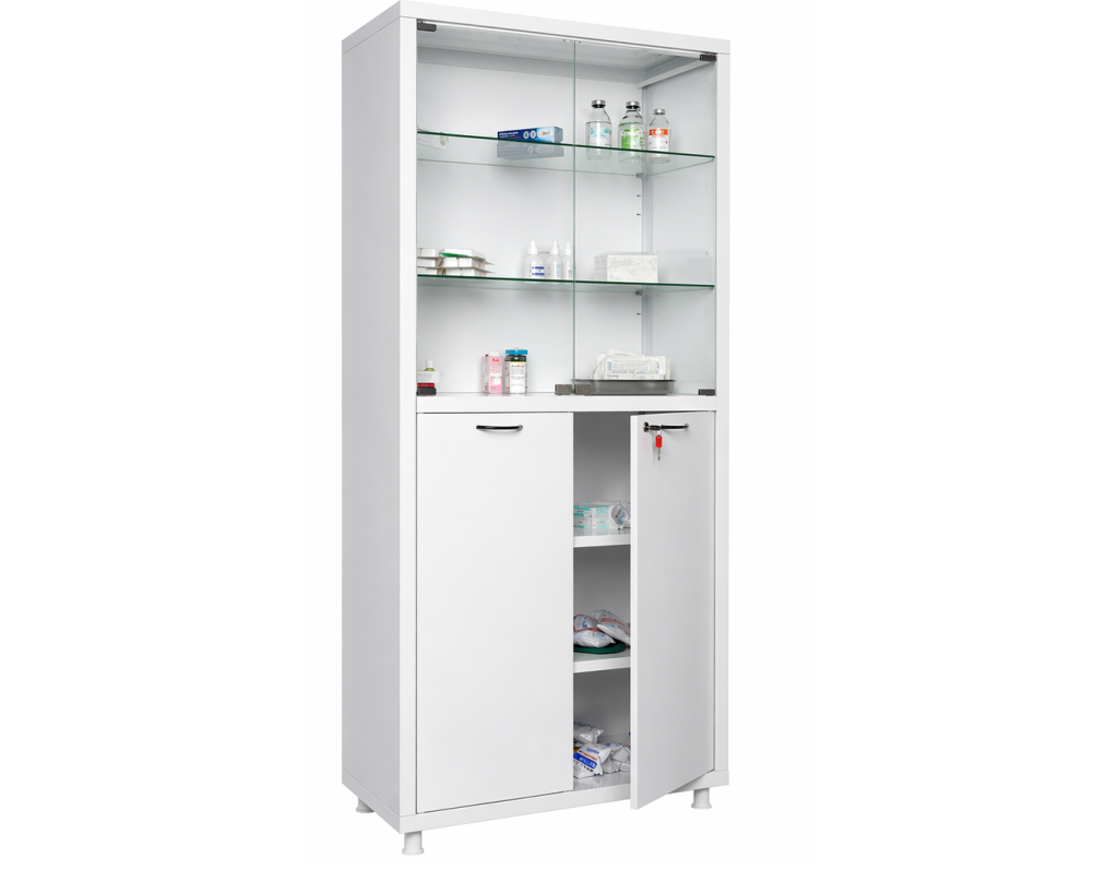 Medicininė spinta HILFE MD2 GLASS – tai talpus ir patikimas sprendimas vaistų, medicinos priemonių bei dokumentų laikymui. Keturių durų konstrukcija su stiklinėmis sekcijomis leidžia patogiai matyti turinį ir užtikrina efektyvų darbo organizavimą medicininėje aplinkoje.